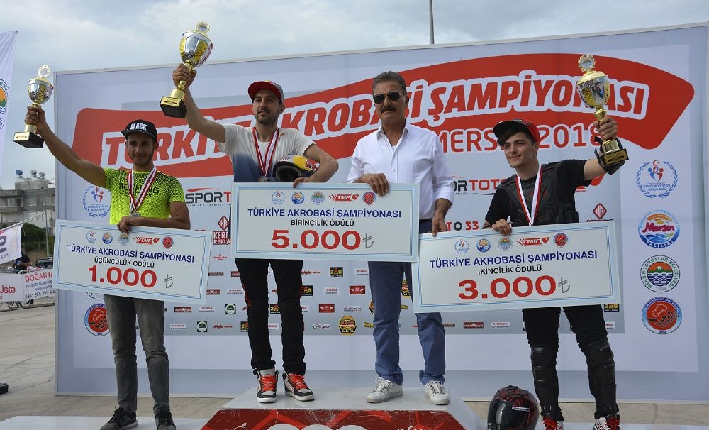 Mersin Motosiklet Kulübü’nün organize ettiği Mersin Valiliği, Toroslar Belediyesi ve Mersin Gençlik Hizmetleri ve Spor İl Müdürlüğü’nün desteklediği Türkiye Akrobasi Şampiyonası ilk kez Toroslar ilçesindeki Cumhuriyet Meydanı’nda iki gün sürdü. Mersin’de geçen yıl hayatını kaybeden Yunus Emre Karan ile arkadaşı Abidin Gül’ün anısına yapılan organizasyonda, Türkiye’nin farklı illerinden 15 sporcu mücadele etti. 33 motosiklet şovmenin müracaat ettiği elemeler sonunda 15 sporcu akrobasi şovlarını sahnelerken, finallerin ardından 529 puan toplayan Bilal Birkan Polat birinci, 438 puanla Hakan Can Namlı ikinci ve 360 puanla Kerim Tuna üçüncü oldu.