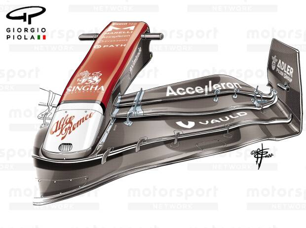 Die großen Regeländerungen in der Formel 1 für die Saison 2022 hatten erhebliche Auswirkungen auf die Gestaltung der Front- und Heckflügel der Autos. Die FIA bestand auf einer strengeren Auslegung, um ausgeklügelte Konzepte zu verhindern, die die Grundlagen für guten Rennsport untergraben könnten. Giorgio Piola Der Frontflügel des Alfa Romeo C42 aus der Saison 2022
